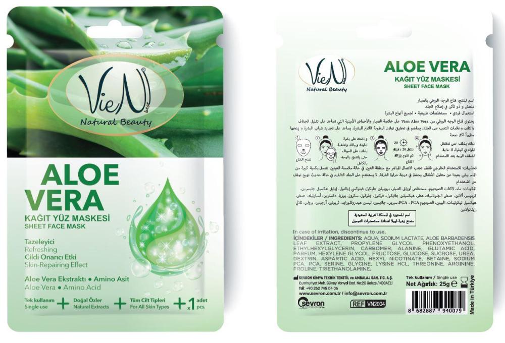 • Package: A bag containing a sheet face mask with aloe vera